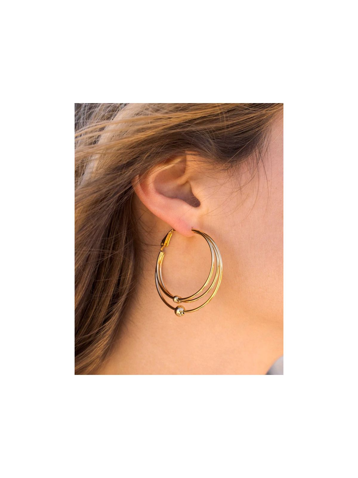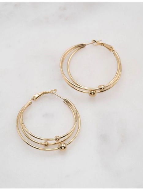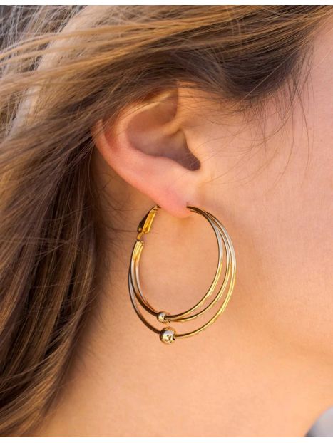 Boucles d'oreilles type créoles composées de plusieurs anneaux et boules. Fermoir cliquet. Dimension: 4,2 x 4,5 cm Disponible en plusieurs coloris : doré et argenté. Matière : Acier inoxydable Hypoallergénique, ce bijou résiste à l'eau et ne noircit pas.