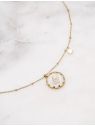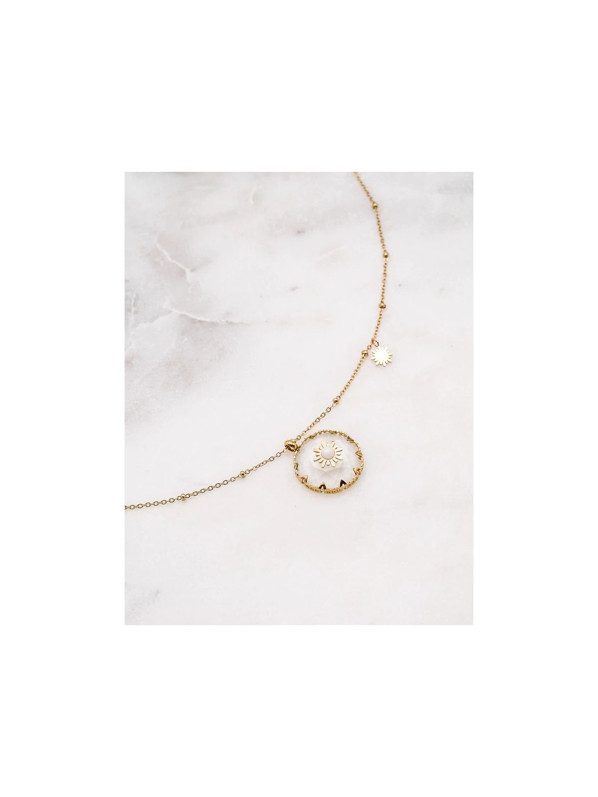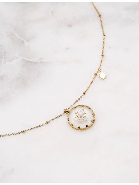 Collier sur chaîne avec fermoir mousqueton et chaînette réglable orné d'un pendentif rond en verre effet translucide, d'une pierre naturelle en son milieu ainsi d'une petite pampille ensoleillée. Matière : Acier inoxydable Longueur : 38 + 7 cm de chaînette Hypoallergénique, ce bijou résiste à l'eau et ne noircit pas.