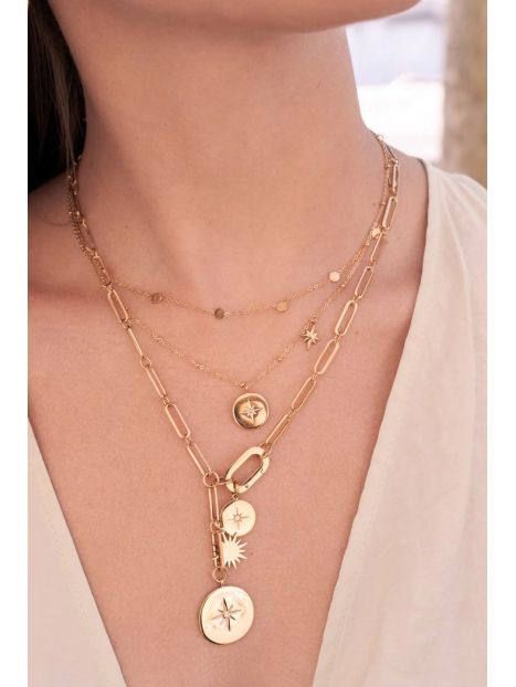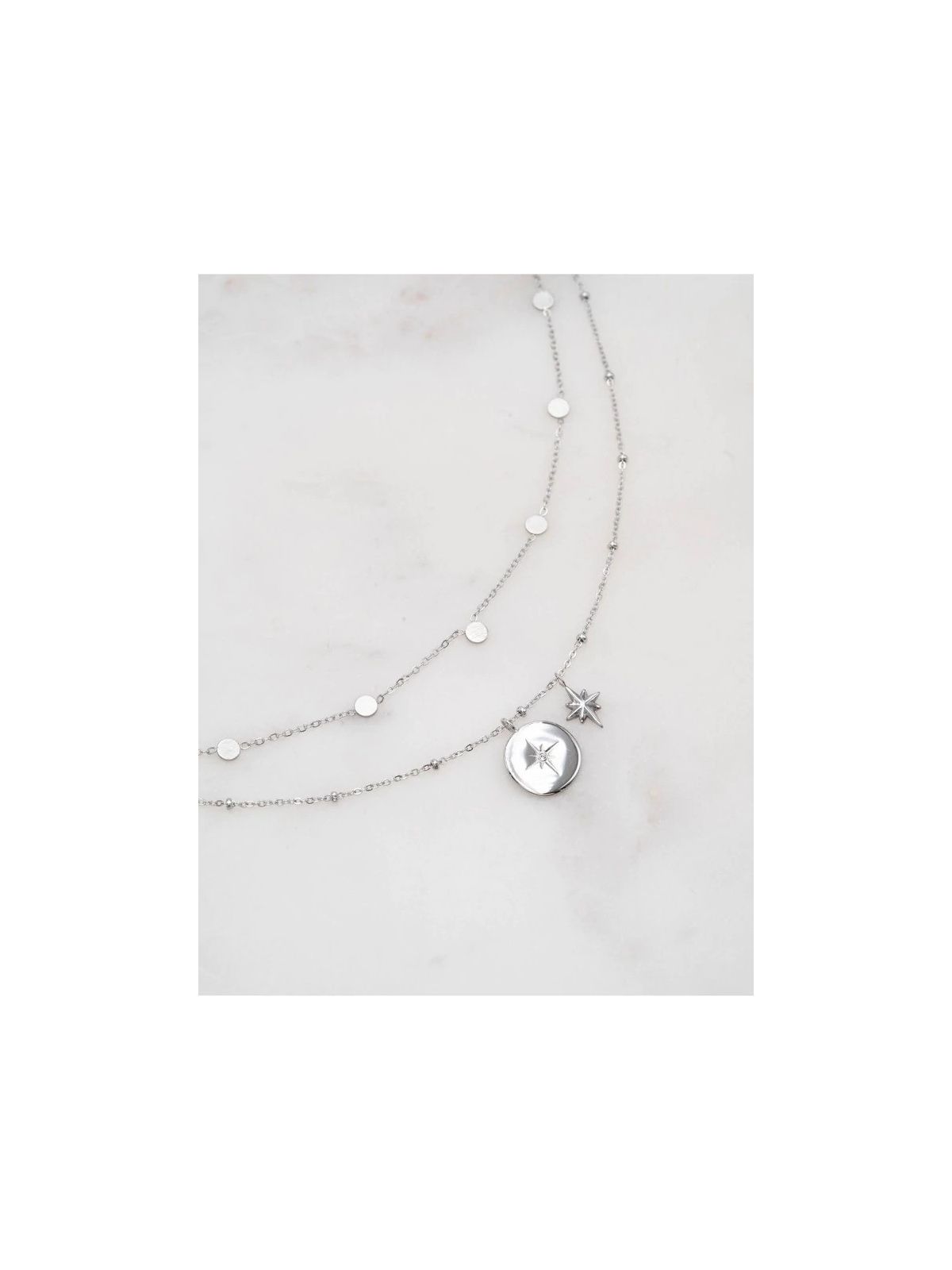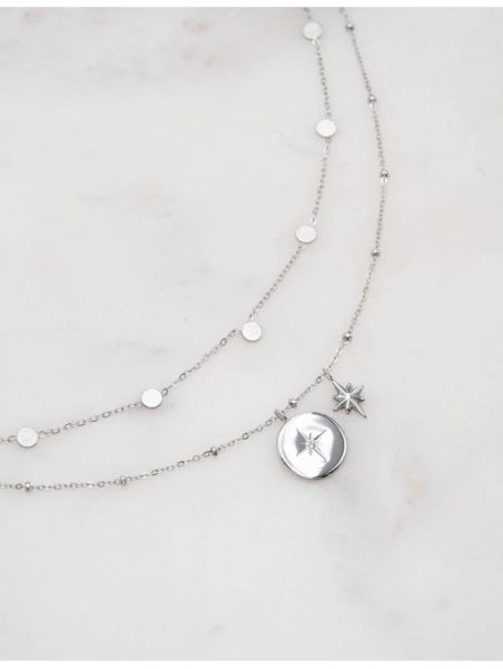 Collier réglable sur chaîne deux rangs avec pendentif étoile du Nord. Fermoir mousqueton et chaînette de réglage. Disponible en doré et argenté Dimension: 38/41 + 7 cm Matière : Acier inoxydable Hypoallergénique, ce bijou résiste à l'eau et ne noircit pas.