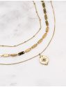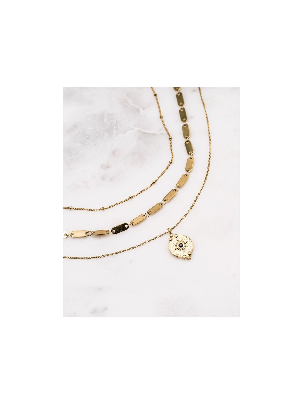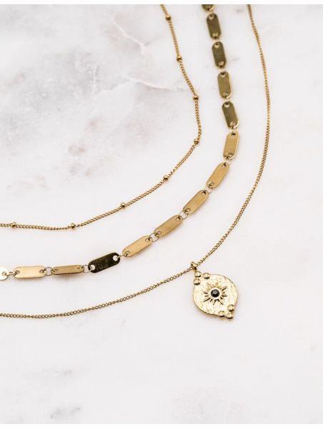 Collier multirangs (3 rangs) réglable avec jeu de mailles et pendant strass.