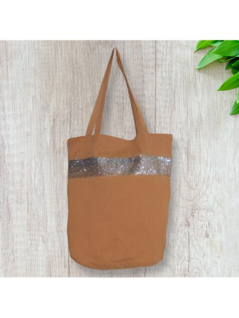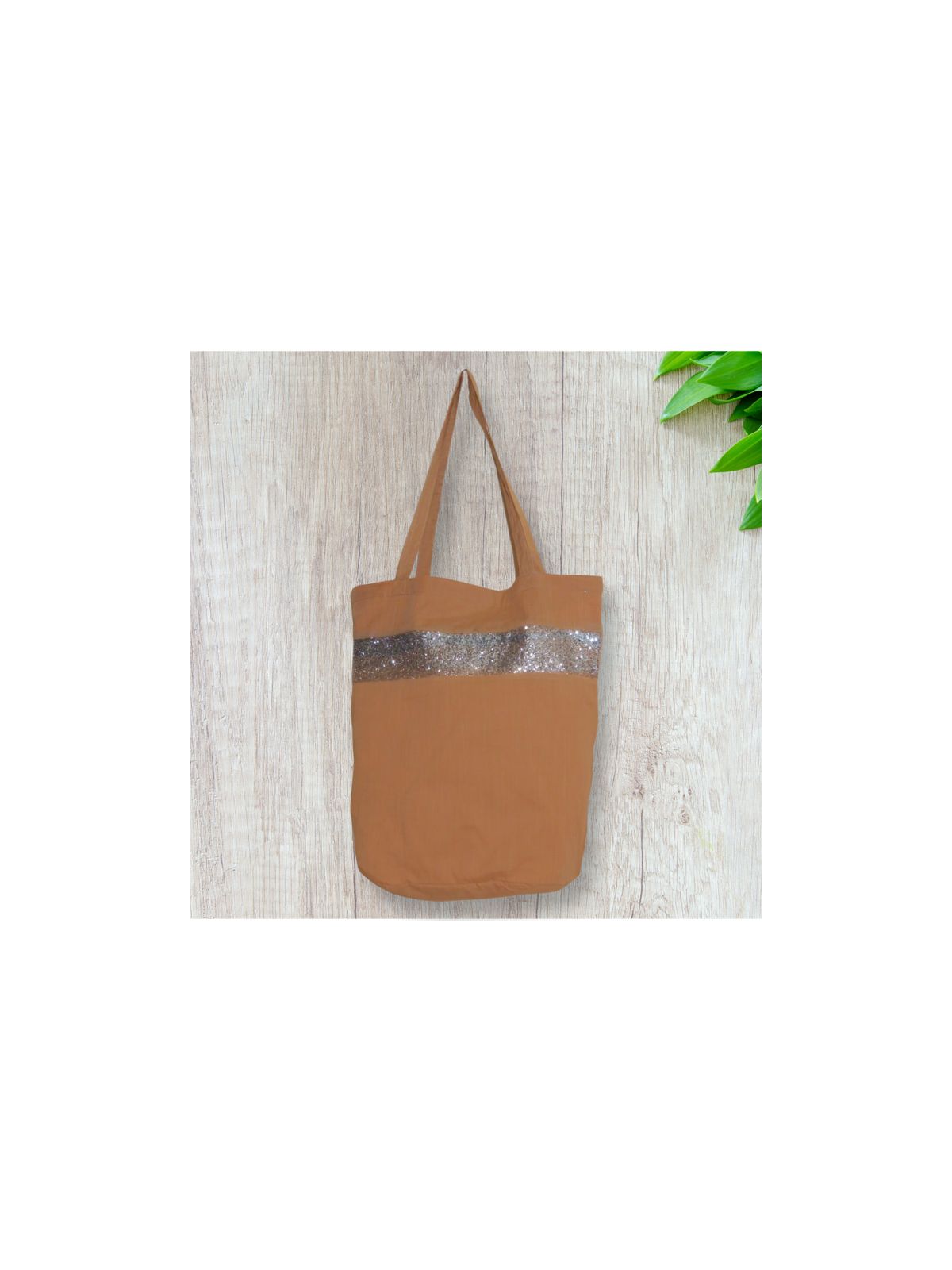 Pour les vacances ou pour tous les jours, sac de courses, d'école, de plage, ce tote bag de couleur est orné d'une bande de paillettes argentées. Il est 100 % coton, et doublé dans une couleur différente.