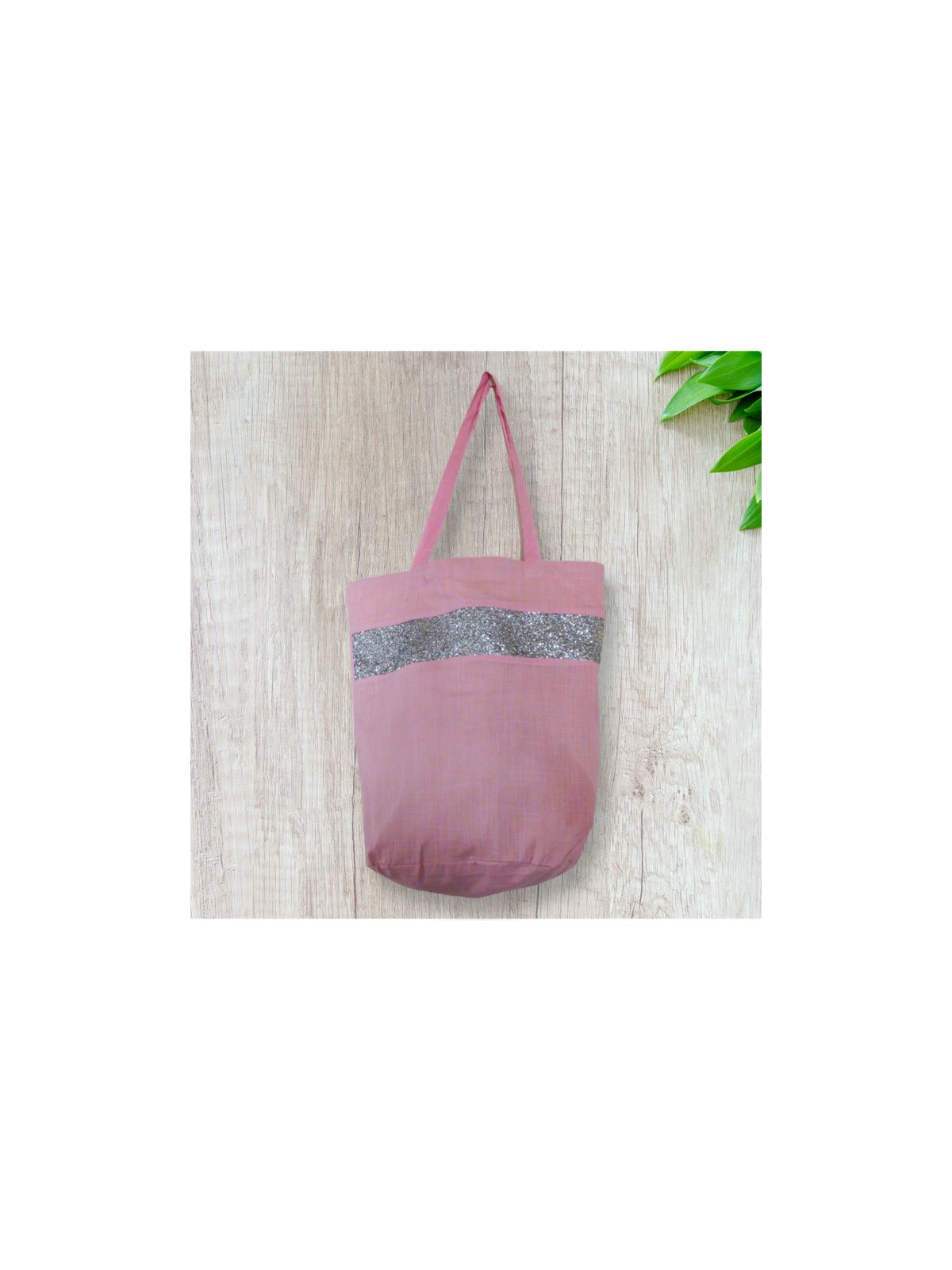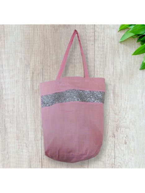 Pour les vacances ou pour tous les jours, sac de courses, d'école, de plage, ce tote bag de couleur est orné d'une bande de paillettes argentées. Il est 100 % coton, et doublé dans une couleur différente.