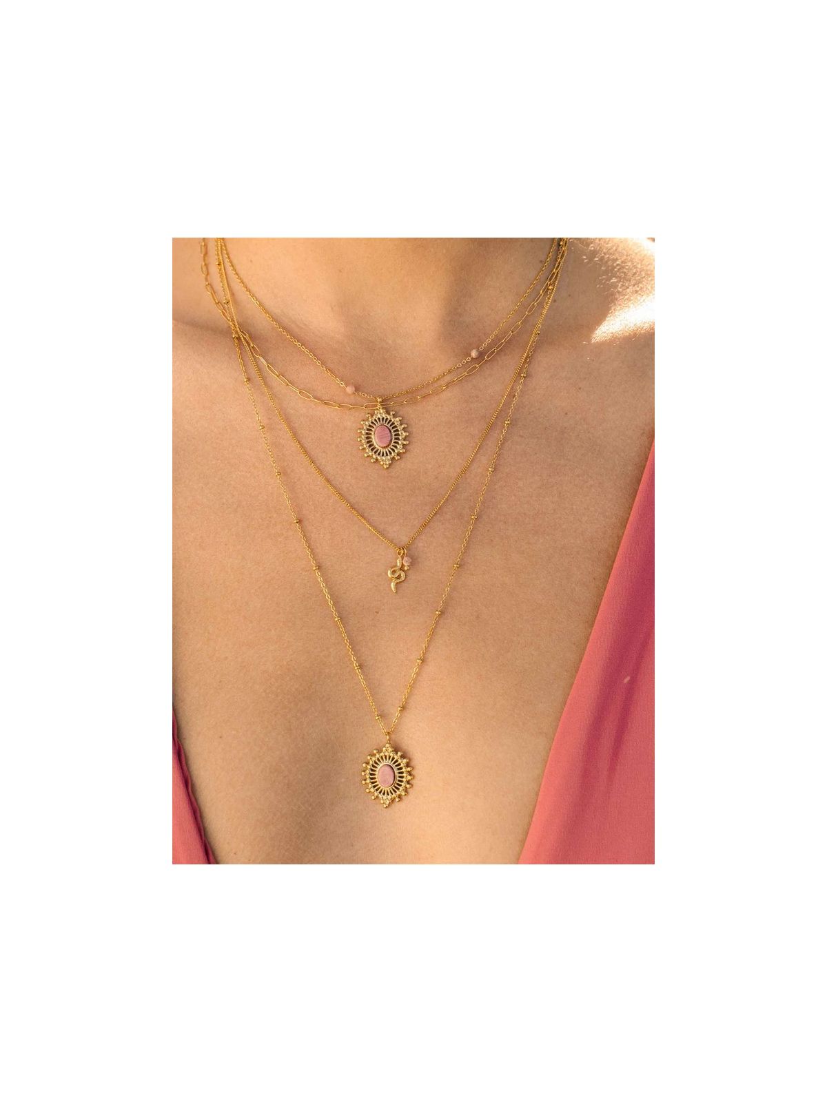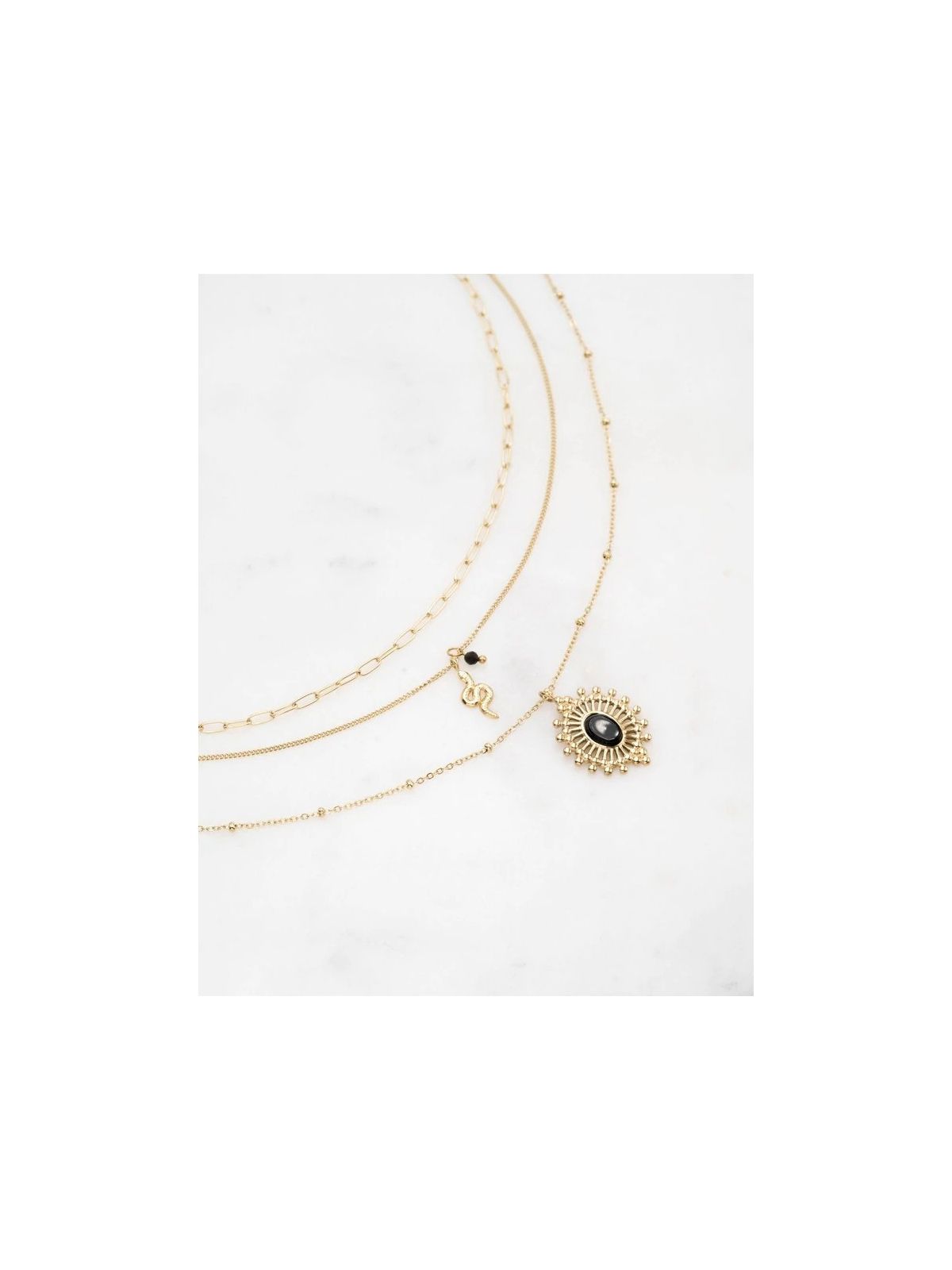 Collier réglable 3 rangs sur chaine composé d'un chaine maillon, d'une chaine avec un pendant au motif serpent et d'une chaine avec une pièce ajourée sertie d'une pierre naturelle et un pendant serpent. Fermoir mousqueton et chainette de réglage. Les pierres naturelles: Onyx Matière : Acier inoxydable Hypoallergénique, ce bijou résiste à l'eau et ne noircit pas. Dimension: 38/44/54 + 5 cm Note: Étant des pierres naturelles, leurs couleurs peuvent varier dune pierre à lautre
