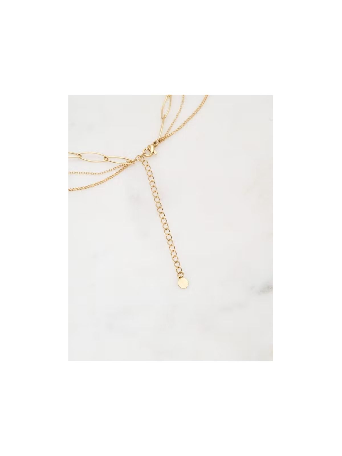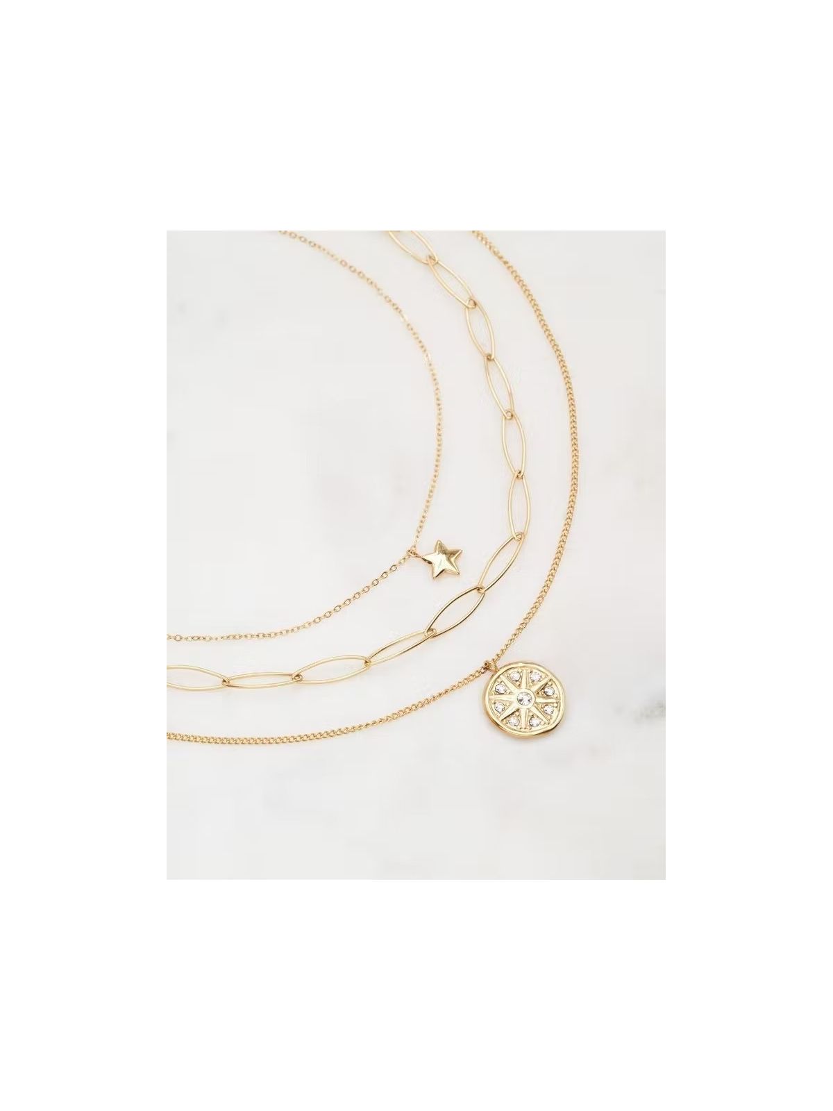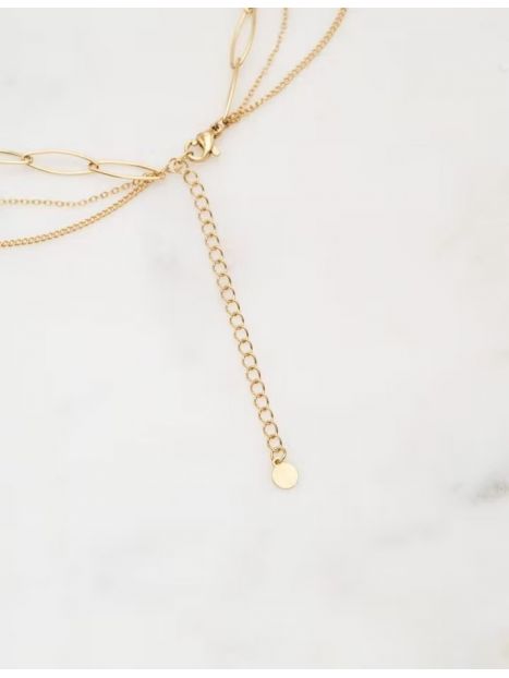 Collier sur chaine réglable multirangs composé : d'un rang maillons, dun rang avec une pampille étoilée et d'un dernier rang avec un pendant au motif étoilé gravé et serti de strass. Fermoir mousqueton et chainette de réglage. Dimension: 37/41/44 +7 cm Matière : Acier inoxydable Hypoallergénique, ce bijou résiste à l'eau et ne noircit pas.