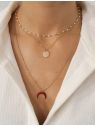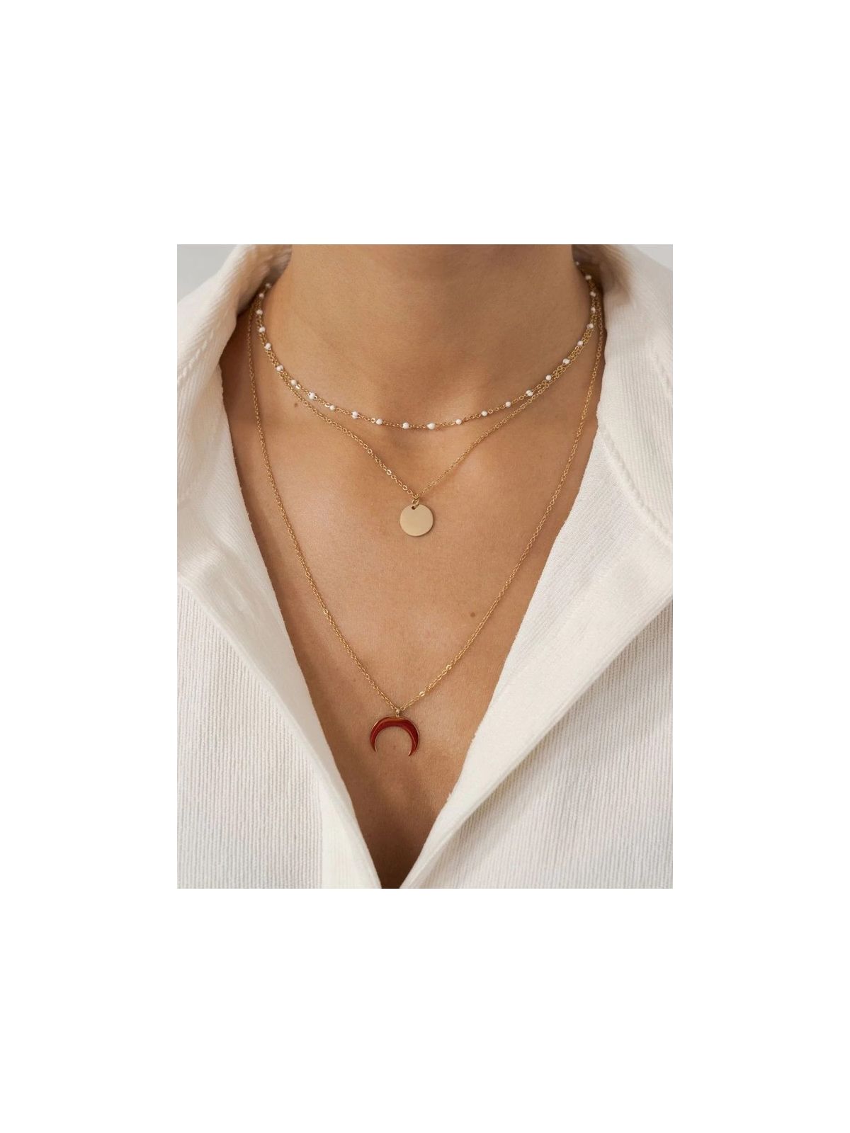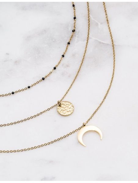 Collier à triple rangs sur chaîne avec fermoir mousqueton et chaînette réglable. Composé d'un premier rang composé de points émaillés, d'un deuxième rang avec un pendentif rond effet martelé, et d'un troisième rang composé d'un pendentif en forme de lune. Matière : Acier inoxydable Longueur : 38/44/54 cm +7 cm de chaînette Hypoallergénique, ce bijou résiste à l'eau et ne noircit pas.