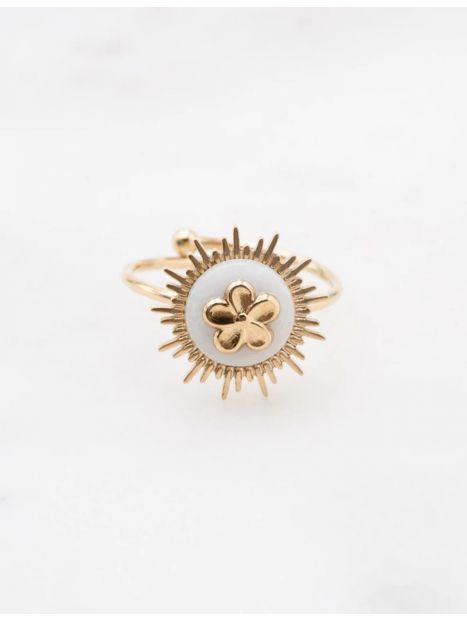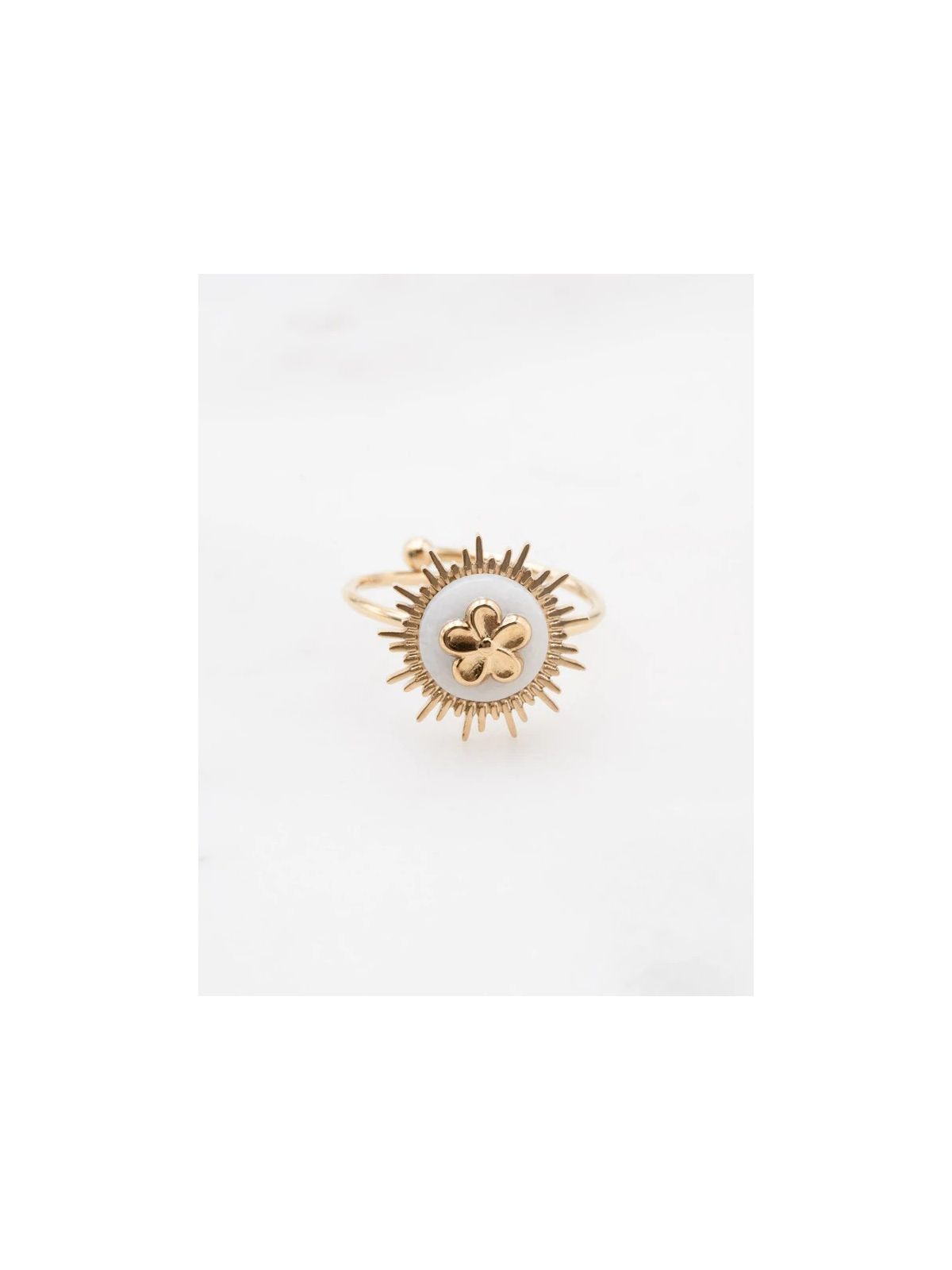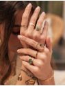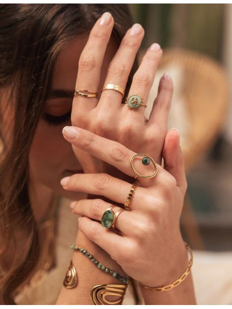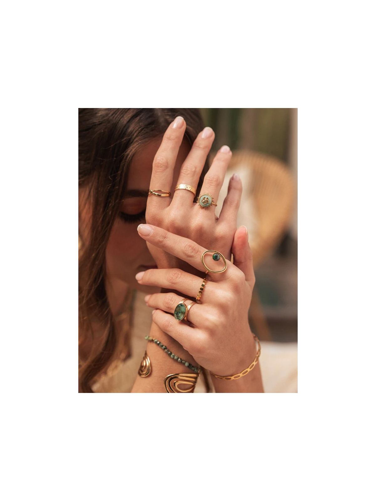 Bague ajustable dorée effet martelée et Pierre naturelle au centre. Pierres naturelles: howlite et jade. Matière : Acier inoxydable Hypoallergénique, ce bijou résiste à l'eau et ne noircit pas. Taille 52 à 56