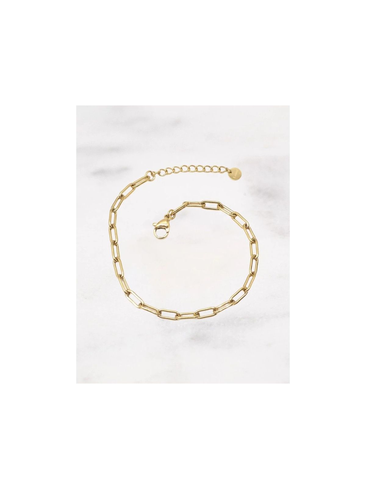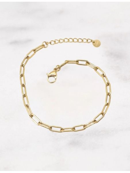 Bracelet sur chaîne en maille rectangulaire avec fermoir mousqueton. Matière : Acier inoxydable Dimension : 17 + 3 cm Hypoallergénique, ce bijou résiste à l'eau et ne noircit pas.