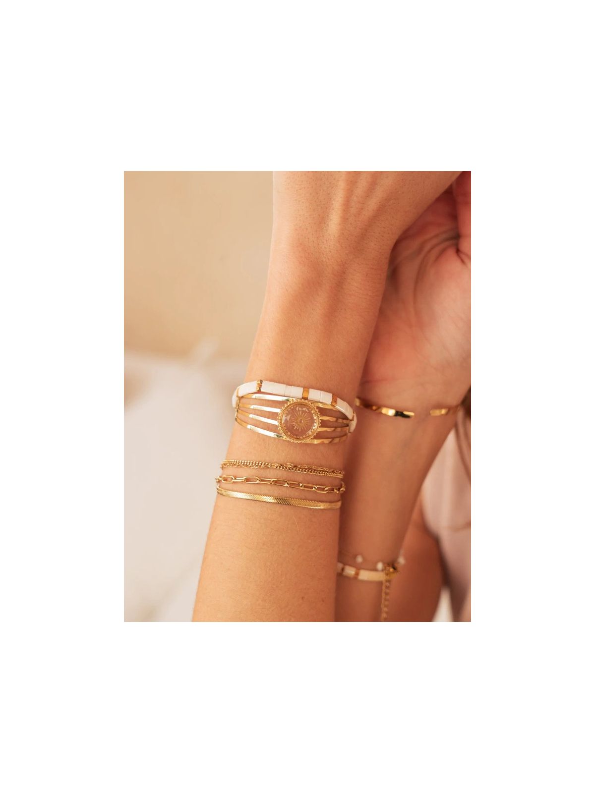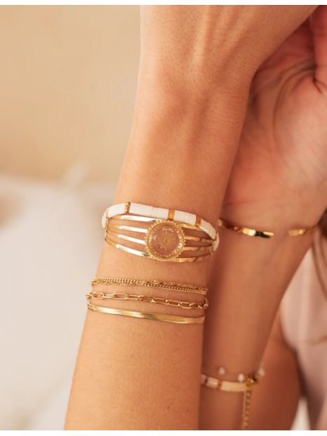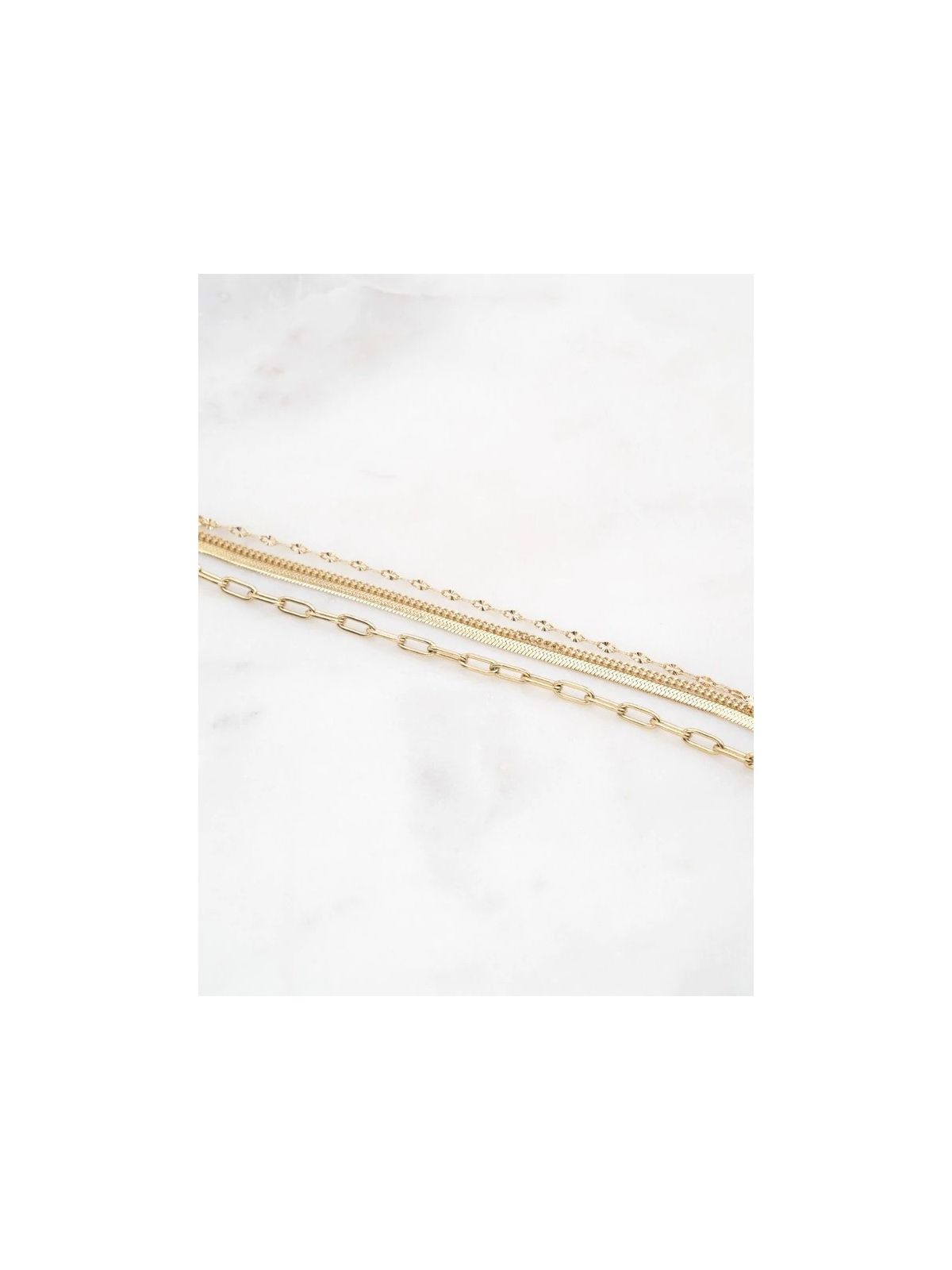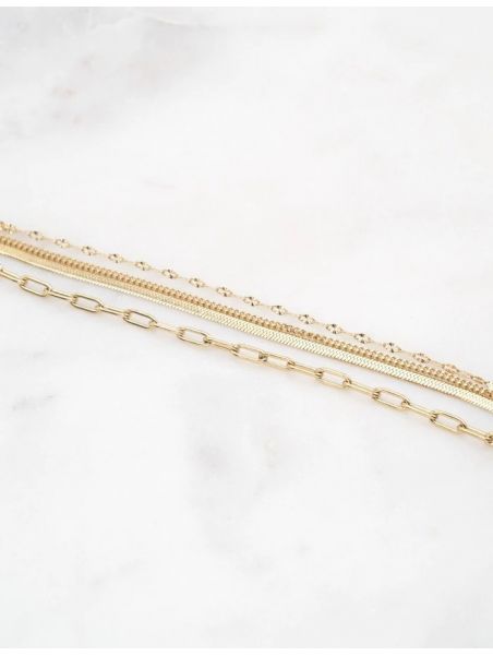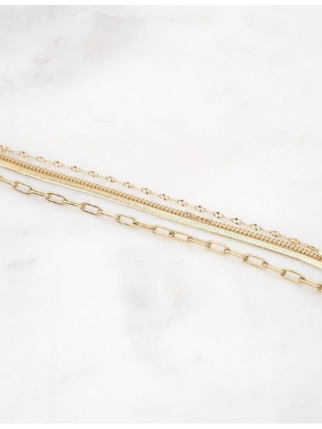 Bracelet réglable sur chaine multirangs avec un jeu de mailles et chaines. Disponible en doré et argenté. Fermoir mousqueton. Matière : Acier inoxydable Hypoallergénique, ce bijou résiste à l'eau et ne noircit pas. Dimension: 15,5+3 cm
