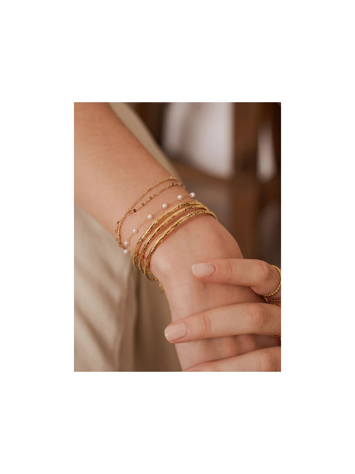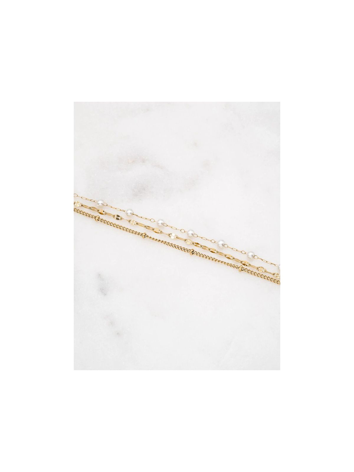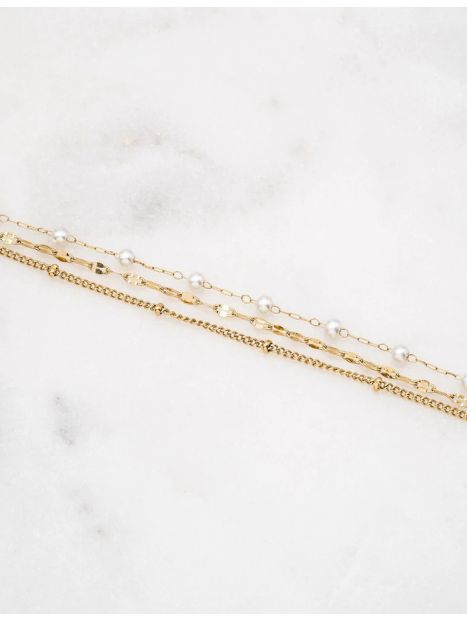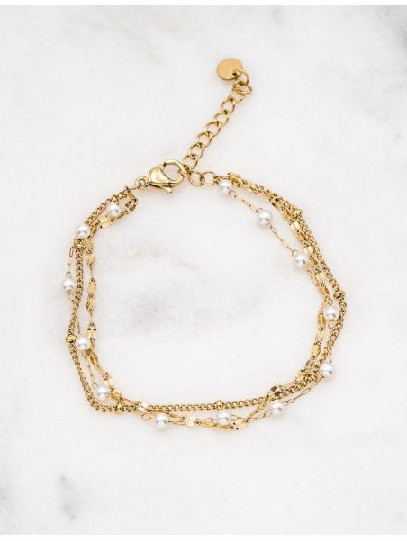 Bracelet réglable 3 rangs avec jeu de mailles et perles d'eau douce. Fermoir mousqueton. Dimension: 16+3 cm. Matière : Acier inoxydable Hypoallergénique, ce bijou résiste à l'eau et ne noircit pas.