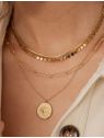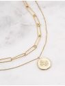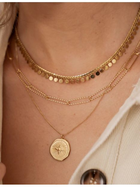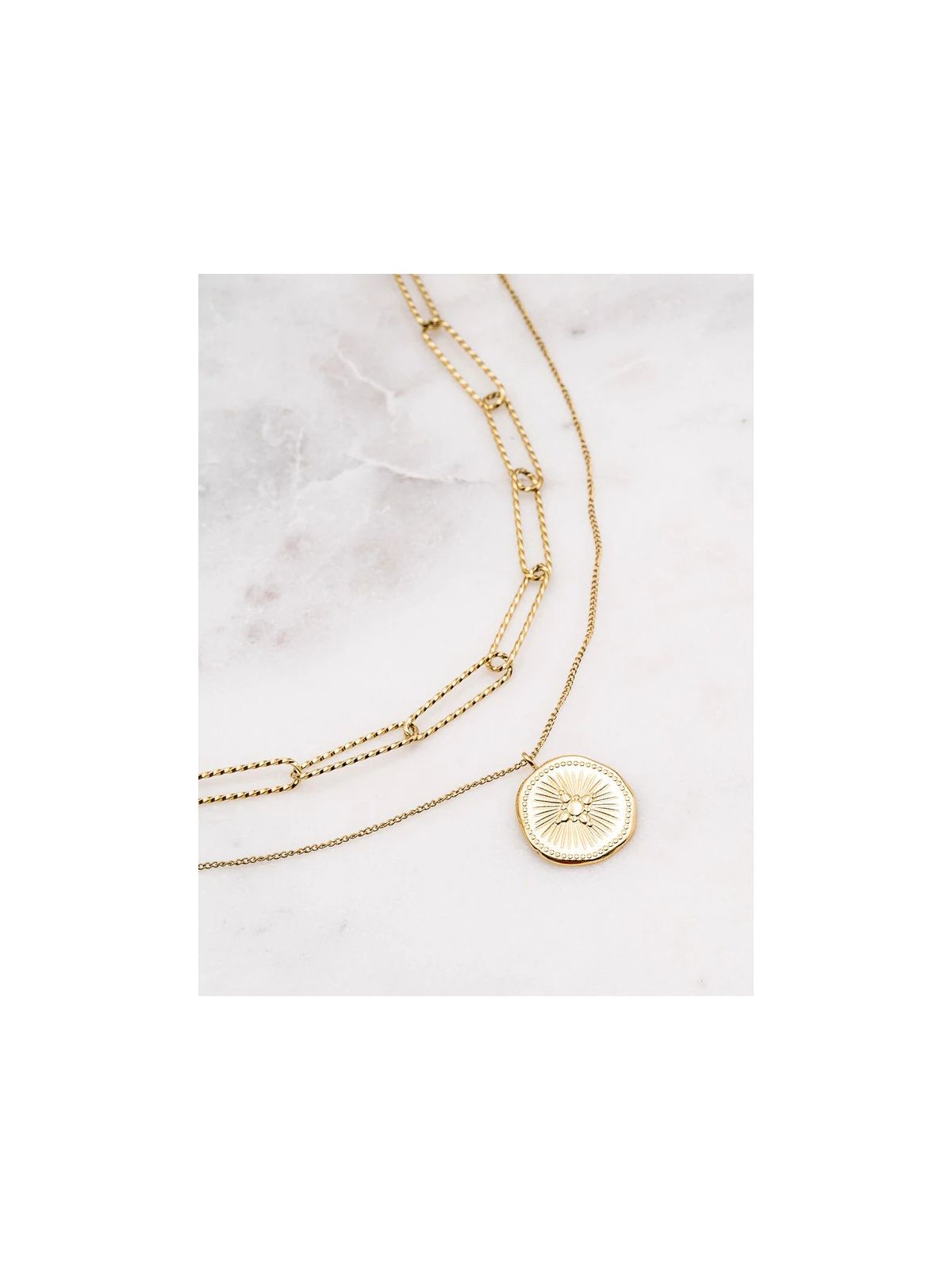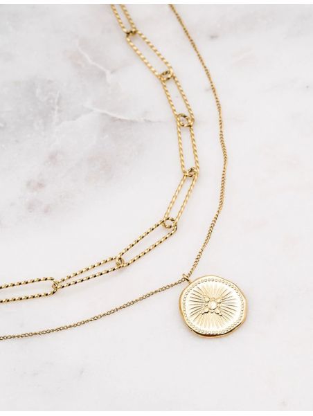 Collier réglable sur chaine: 2 rangs jeu de mailles avec pendant texturé . Fermoir mousqueton. Dimension: 38/42+7 cm Matière : Acier inoxydable Hypoallergénique, ce bijou résiste à l'eau et ne noircit pas.