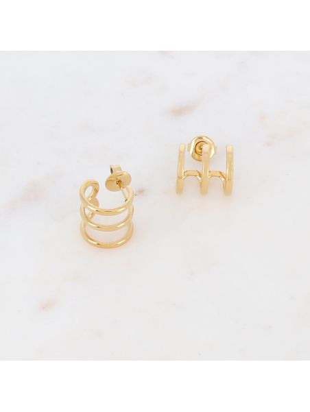 Boucles d'oreilles de type créoles à puce triple rangs, effet lisse. Fermoir papillon. Matière : Acier inoxydable. Hypoallergénique, ce bijou résiste à l'eau et ne noircit pas. Dimension : 0,9 x 1,2 cm.