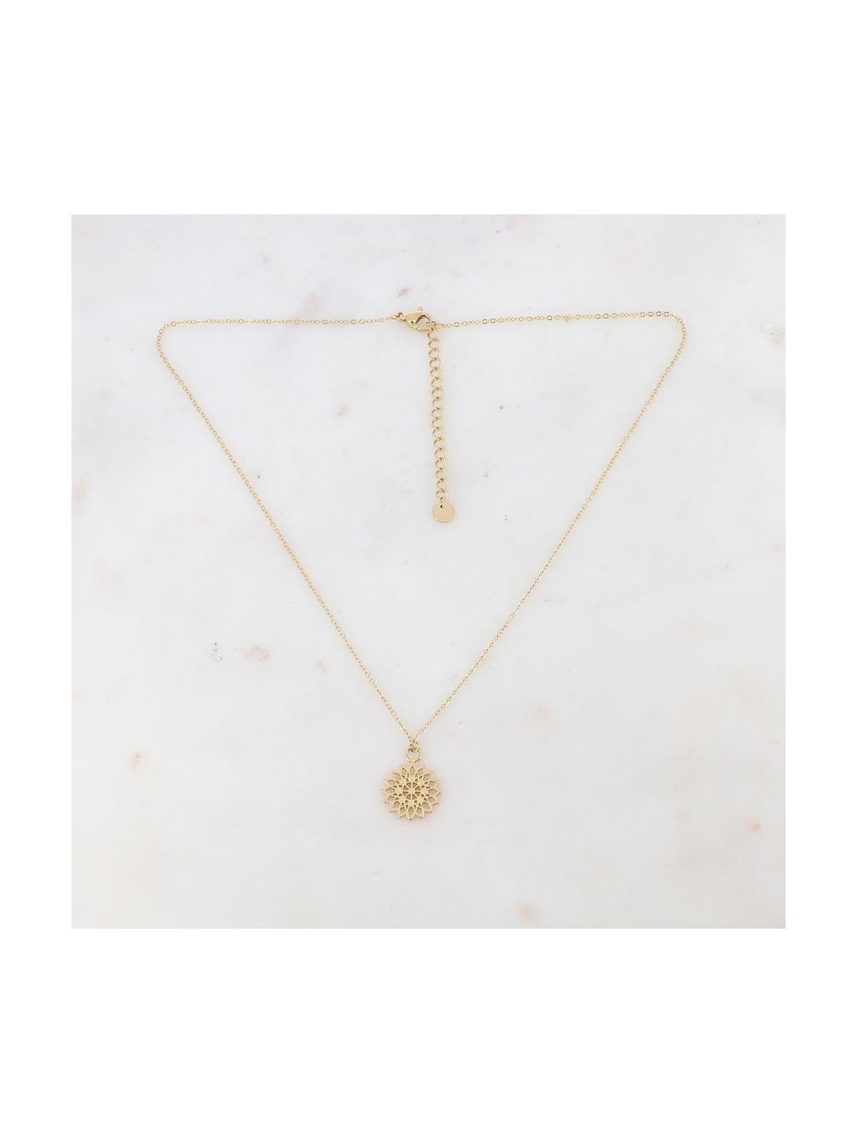 Collier sur chaîne avec fermoir mousqueton composée d'un pendentif en forme de rosace. Matière : Acier inoxydable Hypoallergénique, il résiste à l'eau et ne noircit pas.